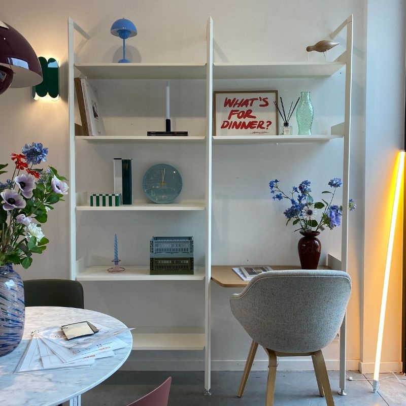 Comme le reste de la collection Rombe, cette configuration est réalisée en bois certifié FSC®, aluminium et acier thermolaqué. Ses lignes épurées et ses détails soignés en font une pièce sculpturale qui offre à la fois du rangement et un espace de travail pratique – parfaite pour le télétravail ou les projets créatifs.