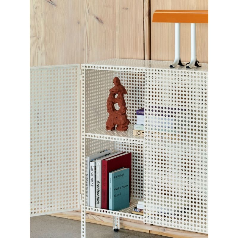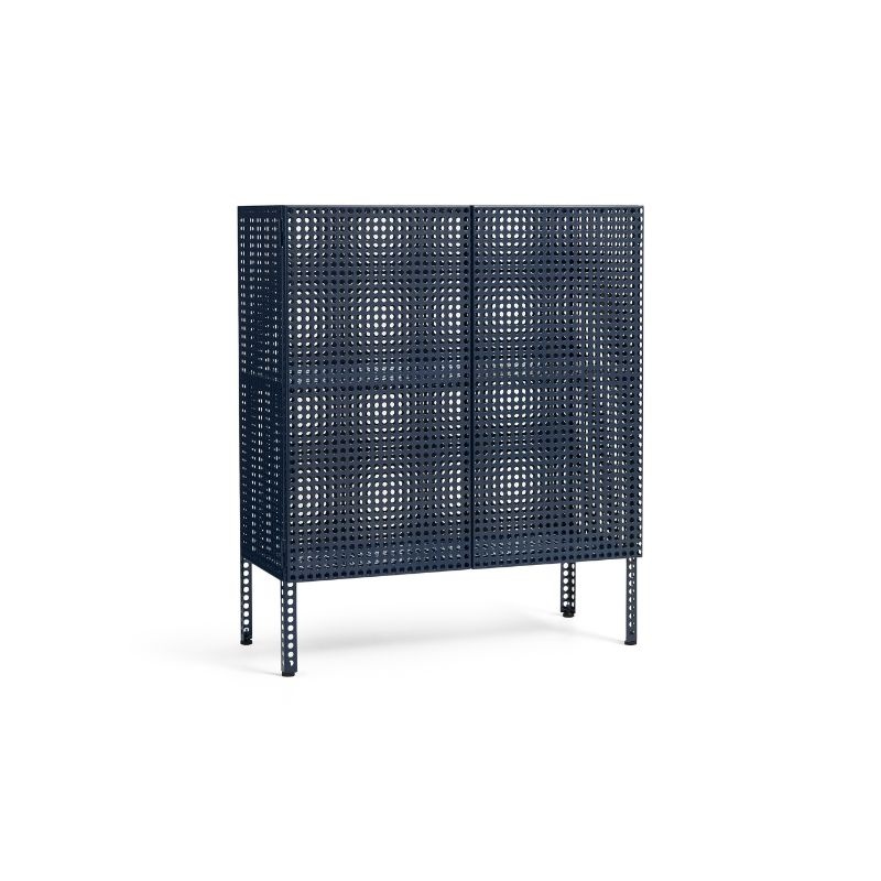 L’armoire Perforated Cabinet Floor de HAY, signée Muller Van Severen, marie rangement et esthétique graphique. Ses portes en acier perforé créent un effet semi-transparent, laissant entrevoir le contenu tout en gardant un aspect ordonné.