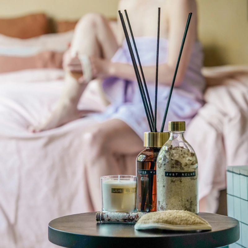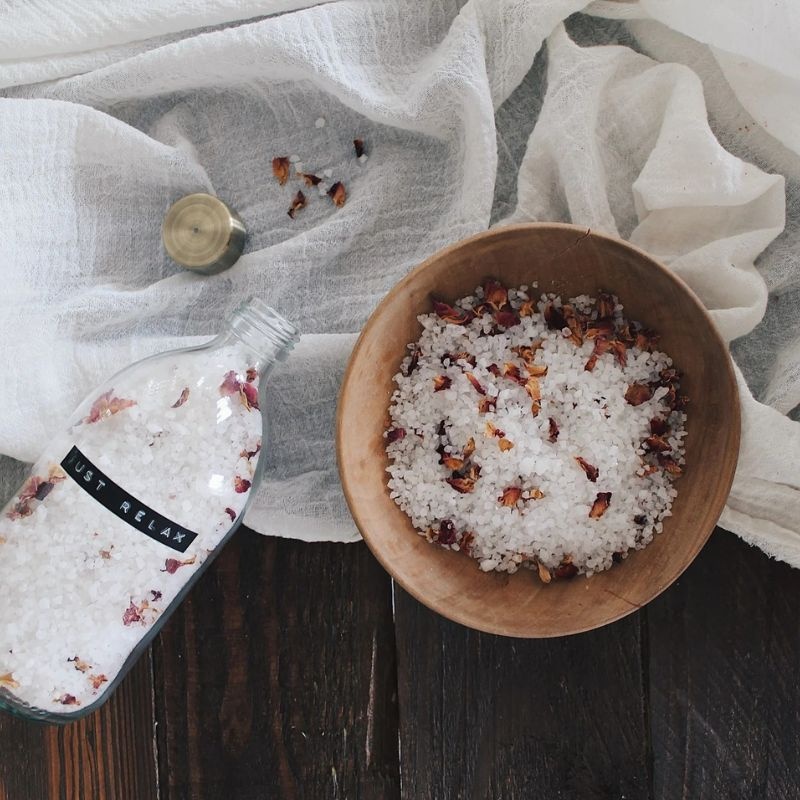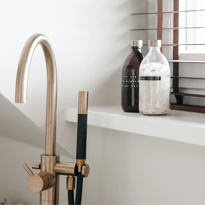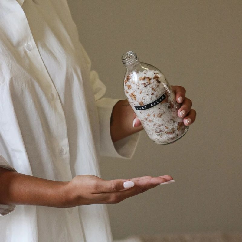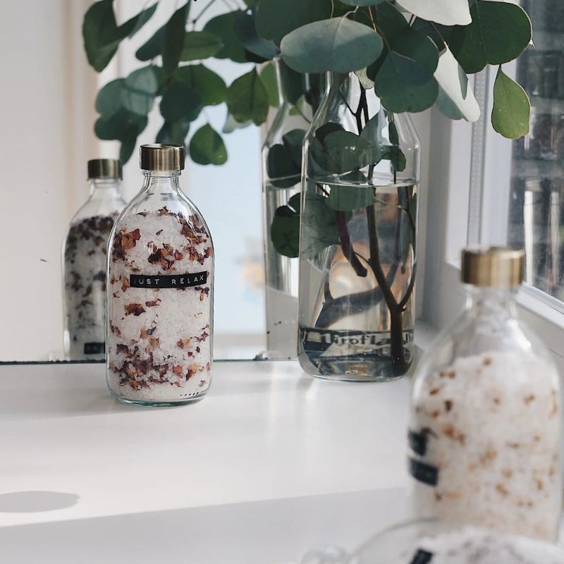 La bouteille en verre avec bouchon en laiton et étiquette dorée ‘Just Relax’ ajoute une touche d’élégance à votre salle de bain. Pas de baignoire ? Utilisez le sel comme bain de pieds relaxant pour un moment spa à la maison.