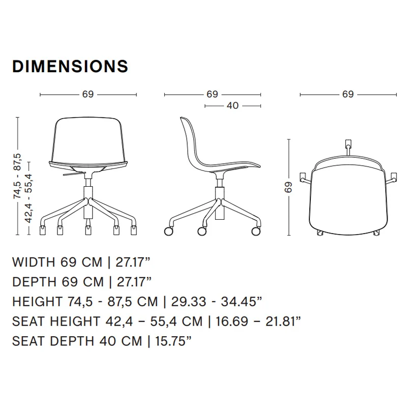 Het onderstel bestaat uit vijf poten met wieltjes onder. je kan de zithoogte veranderen via het gasliftje van 42.4 en 55.4 cm.