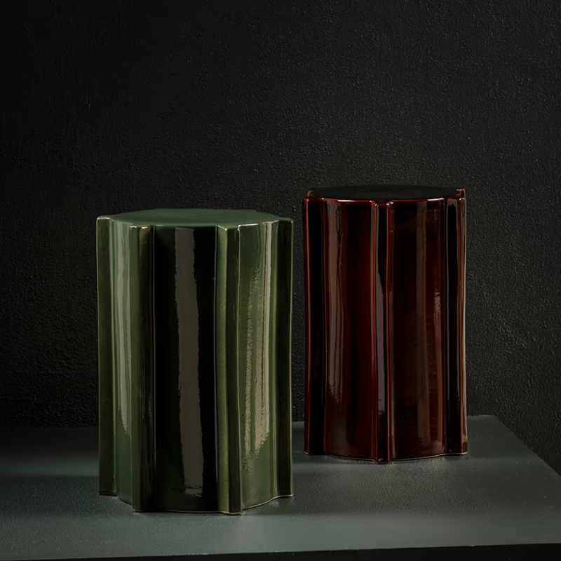 De Bijzettafel 02 van Serax, ontworpen door Marie Michielssen, is een stijlvol statement in elk interieur. Deze sculpturale tafel is gemaakt van geglazuurd steengoed en afgewerkt in diepe, warme tinten zoals groen, oker en donkerbruin. De verticale groeven zorgen voor een subtiel spel van licht en textuur, en geven de tafel extra karakter.