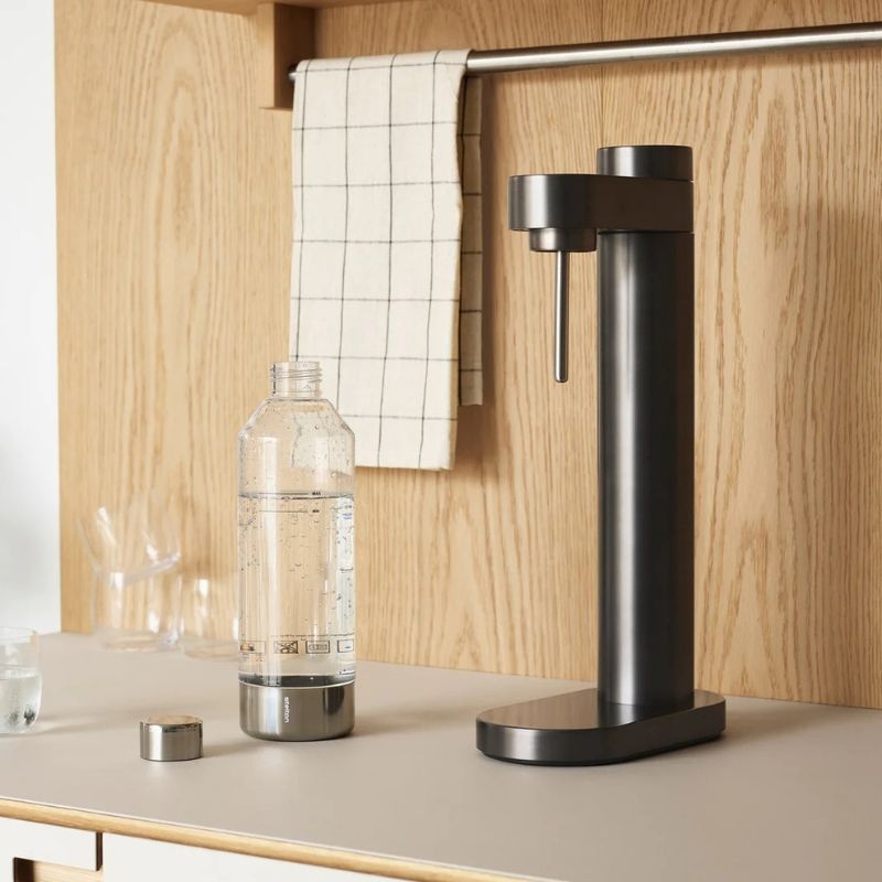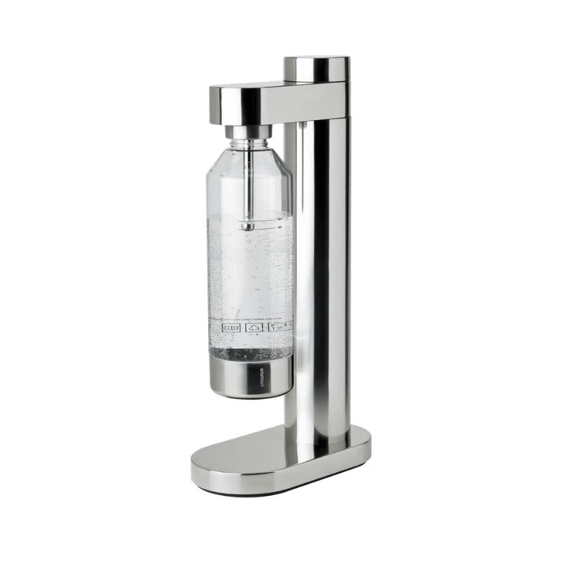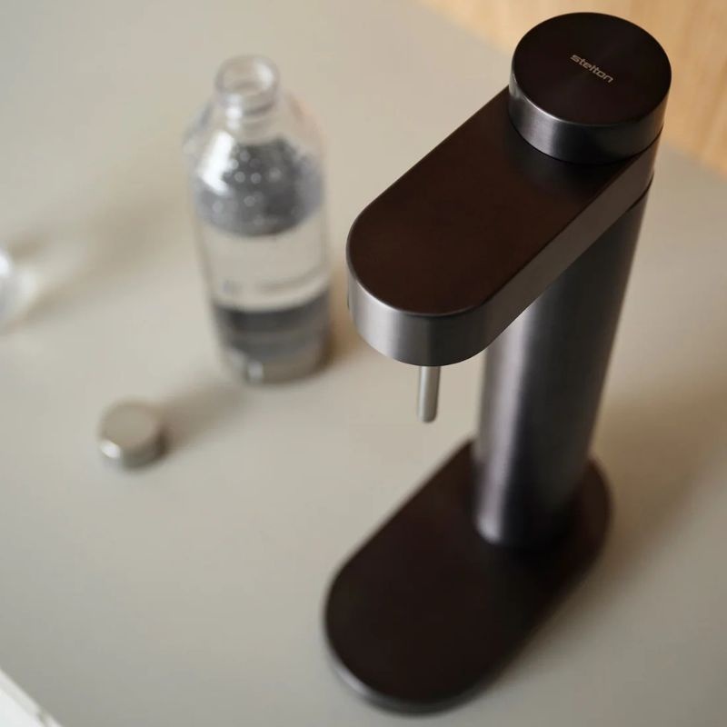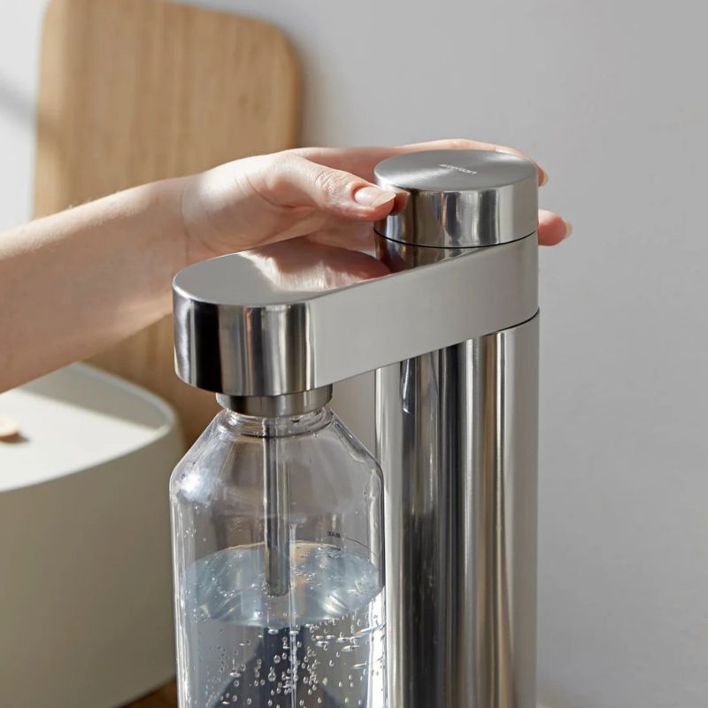 De cilindrische vorm verwijst naar Steltons iconische designlijn. Dankzij de draaiknop bepaal je zelf de hoeveelheid bubbels. De Brus Carbonator wordt geleverd met een herbruikbare Brus-fles en is compatibel met de meeste CO₂- gasflessen(425 g / 60 L), bijv. de Sodastream gasflessen.