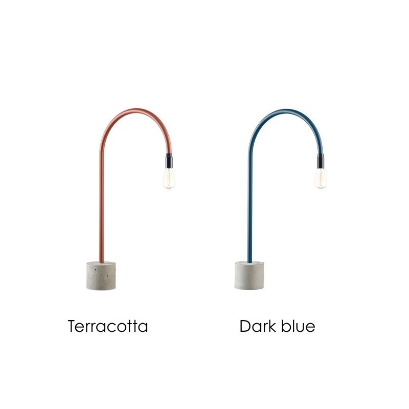 Minimalistische lamp die vertrekt uit een ronde, betonnen voet, overgaat in een armatuur uit gebogen buismateriaal en eindigt in een lamp. De stalen buis is verkrijgbaar in verschillende kleuren.