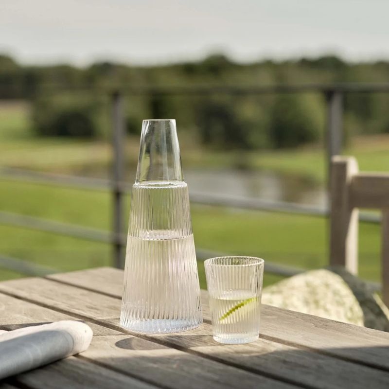 De set bestaat uit een karaf van 1 liter en een glas van 15 cl dat tevens dienstdoet als deksel – ideaal voor op het nachtkastje, het bureau of tijdens een diner. Geschikt voor zowel koude als warme dranken, en prachtig te combineren met de andere items uit de Pilastro-collectie.