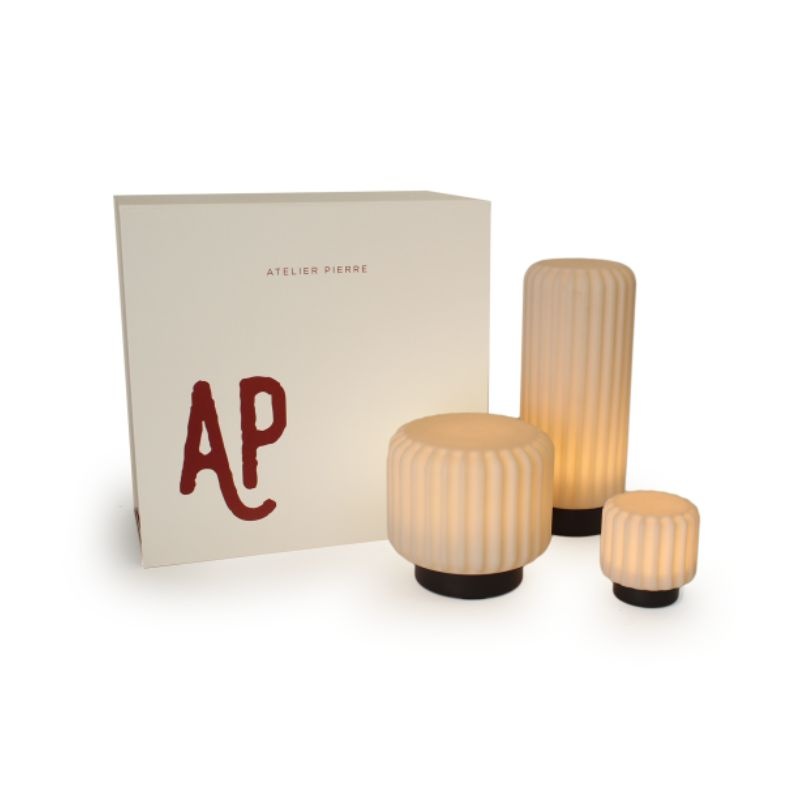 De Dentelles luxe giftbox van Atelier Pierre bevat drie elegante lampen – Mini, Wide & Tall – in een bijpassende afwerking. Samen vormen ze een sfeervolle set die warmte en gezelligheid uitstraalt in elk interieur.