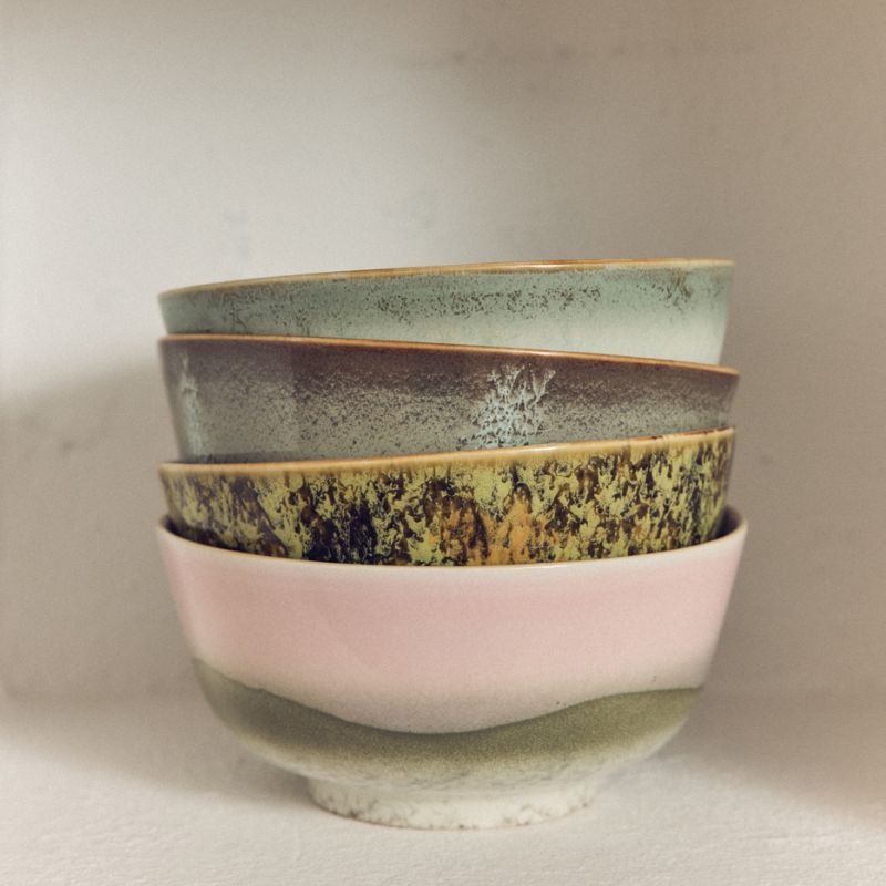 De kommen worden met de hand geglazuurd, waardoor elke set een unieke variatie in kleur en structuur heeft. De retro tinten, aardse finishes en organische nuances maken ze echte blikvangers op tafel.