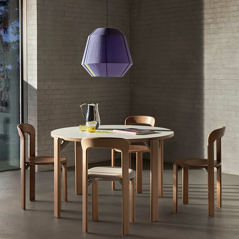 Het frame is gemaakt van massief beukenhout en het tafelblad is in laminaat of fineer. Beschikbaar in verschillende kleuren.