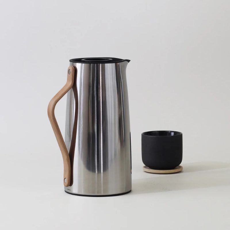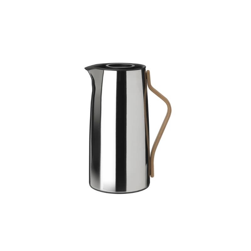 De Emma thermoskan van Stelton, ontworpen door het Deense duo HolmbäckNordentoft, is een icoon van modern Scandinavisch design. De combinatie van glanzend roestvrij staal en een handvat in natuurlijk beukenhout zorgt voor een elegante balans tussen vorm, functie en warmte.