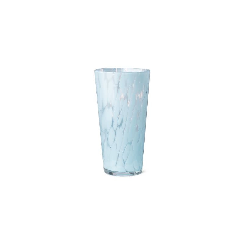 De Casca vaas van Ferm Living brengt een vrolijke, artistieke toets in huis. Elke vaas is mondgeblazen en heeft een organische, asymmetrische vorm met een uniek patroon van blauwe kleurvlekken; geen twee exemplaren zijn hetzelfde.