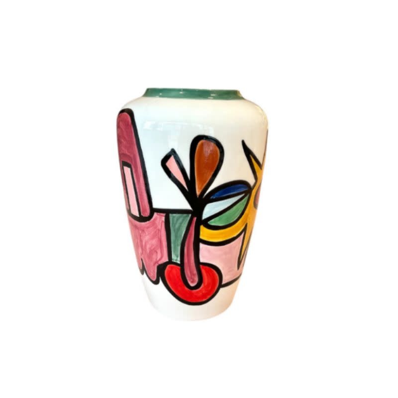 De Julie Loeckx vaas van Val Pottery is een bijzondere samenwerking tussen de Belgische ontwerpster Julie Loeckx en de Portugese keramiekmakers van Val Pottery. Elke vaas wordt met de hand beschilderd en draagt het herkenbare grafische kleurenpalet van Julie Loeckx. Een combinatie van vakmanschap en artistieke expressie.